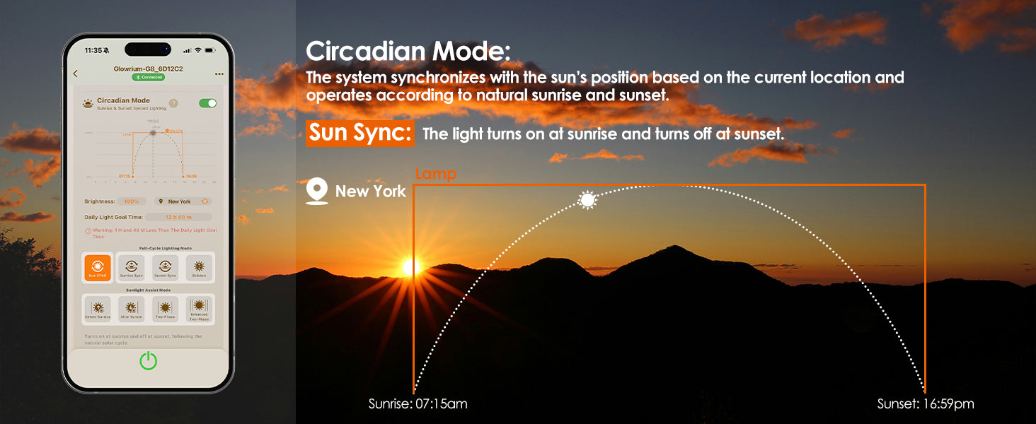 Set two different light cycles per day, or let the lamp sync with your local sunrise and sunset for a natural rhythm. Your Fiddle Leaf Figs, Monsteras, and Bird of Paradise wake up gently, grow strong all day, and rest naturally at night—just like in the wild.