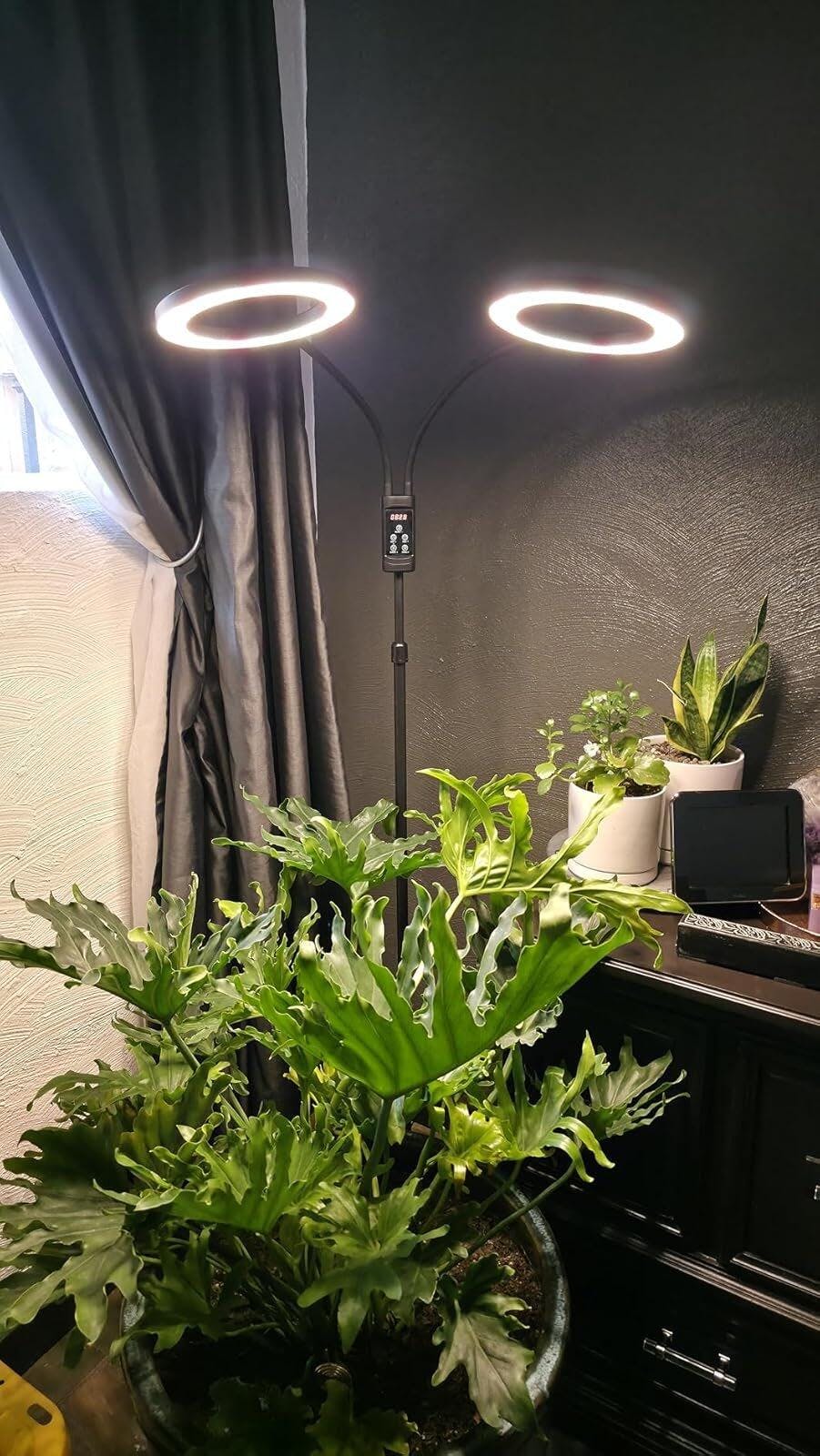 indoor plants are a fussy bunch to grow and keep healthy. Sometimes no matter that you do, the plants just don't seem healthy enough. I especially have a problem during the winter months because my windows that face south are too small and dark due to the patio cover. So, the only solution is the order grow light like this one. Having 2 heads is Definity better than one in most cases. At least in this case. I am able to cover more plants in a given area than ever before. Now to be transparent, I have just received this light and am trying it on a split leaf, which I have problems with every winter, and a snake plant, and a couple of other unnamed plants, please see the photos. So far everything is going very well and the plants like the extra light, but I am going to extend this review through the winter and give you an update. I expect the plants to thrive this winter since they are doing so well at this time.